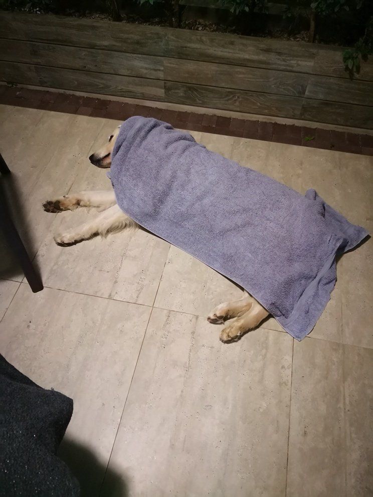 Finn is ook al helemaal gewend. Hier in de wijk zijn veel honden, allemaal achter het hek op het terrein van hun baasjes. Zo langzamerhand begint ie wat kennis te maken en ook wat uit te dagen (ze kunnen toch niet bij hem komen). Dat ze hier hele grote ballen met een vreemde vorm hebben, schijnt hem niet te deren.